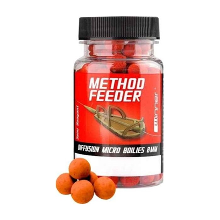 Method Feeder Diffusion Micro Boilies je speciálně navrhnutá, neutrálně vyvážená návnada s vysokým obsahem látek určených k aromatizaci extraktů a chutí. Obsahuje také ve vodě viditelné barvivo, které vytváří fluorescenční oblak, jež se uvolňuje kolem návnady a účinně tak láká ryby.