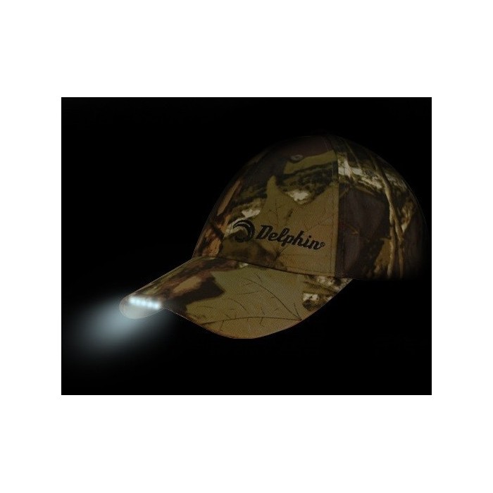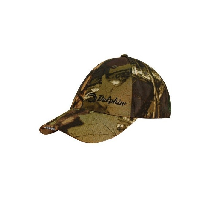 Letní čapka- kšiltovka s LED diodami od značky Delphin ve vyhotovení kamufláž. Kšiltovka je univerzální velikosti a pomocí suchého zipu na zadní části je možné přesně nastavit požadovaný obvod tak, aby pohodlně sedla každému.Obrovskou výhodou je 5 LED diod umístěných v přední části kšiltu které můžete využít za zhoršené viditeľnosti.