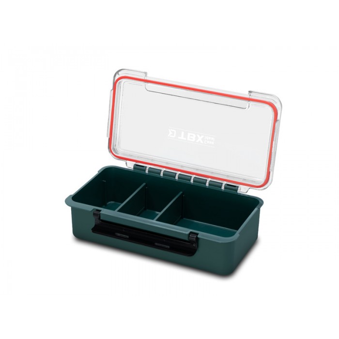 Uvnitř se nachází odnímatelná polička, která rozděluje box na dvě části. Polička je rozdělena až pěti odnímatelnými přepážkami, díky kterým si vnitřní uspořádání přizpůsobíte přesně podle svých potřeb. Hlavní úložný prostor je rozdělen dvěma odnímatelnými přepážkami. Pokud se rozhodnete tyto přepážky vyjmout, vytvoříte si ještě větší prostor pro odložení vašeho rybářského příslušenství. Transparentní víko umožňuje mít vždy dokonalý přehled o obsahu, zatímco gumové těsnění po celém obvodu a pevný plastový klip zaručují bezpečné uzavření i během transportu. Díky gumovému těsnění je krabice vodotěsná.