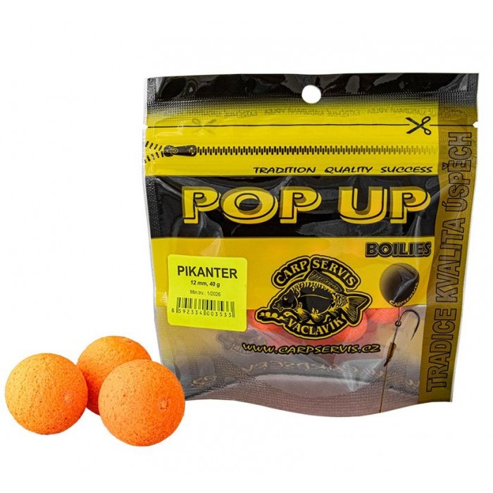 Plovoucí boilies Pop Ups Carp Servis kopírují svými variantami klasické boilies v nabídce firmy Carp Servis Václavík. Předností je bezesporu značná stabilita vztlaku, a to i po více než 12 hodinách nastražení ve vodě. Je možné je snadno dodatečně dipovat v tekutých dipech. Funguje až do zámrzu.