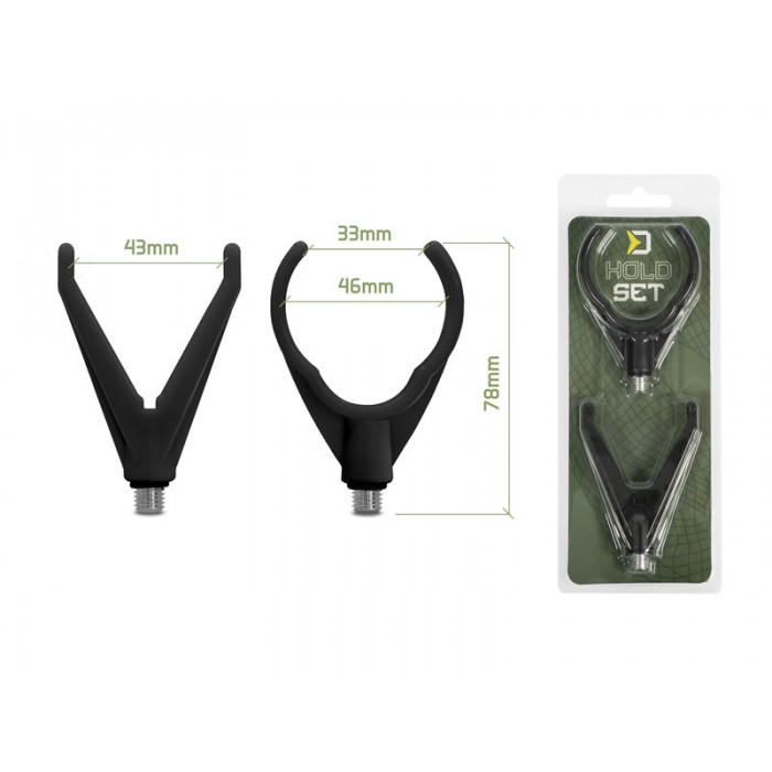 HoldSET je vyroben z odolného plastového materiálu a díky své praktičnosti a ceně jej ocení jak začátečníci tak zkušení rybáři. Zadní držák, navržený ve tvaru písmene U, umožňuje bezpečné uložení prutů s různými průměry rukojetí. Přední držák ve tvaru písmene V je opatřen drážkou, pro plynulý přechod vlasce během záběru.